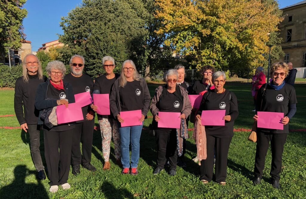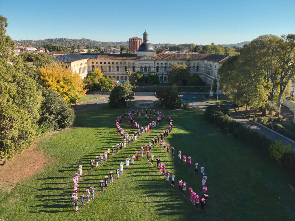 L’association DYGEL de Villeneuve-sur-Lot a pris part à la chaîne humaine représentant le ruban rose (photographie aérienne par la Mairie de Villeneuve sur Lot).
